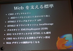このデモでは、HTML5 Video/Audioタグのデモも兼ねていて、ライセンスに制限されることの無い、動画形式「Ogg Theora」(MacではVLCが対応)と、音声形式「Vorbis」(QuickTimeでは、Xiph QuickTime Componentsが必要)をサポートしていると説明していました。