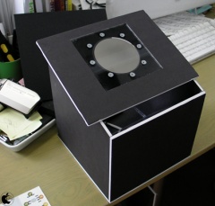 そこで、情報通信研究機構(NICT)が開発したミクロサイズの鏡を複数組み合わせた反射版?を使い、裸眼で映像を空中に浮かんでいるように見える箱を見せてもらいました。