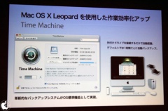 セミナー対象者として Windowsユーザ・販売担当者が多く含まれていることから、セミナーの最初は TImeMachineの動作デモ・BootCampによって Windows が Mac でネイティブに動作すること・プレビュー.app で Photoshop psdファイルを表示出来ること・QuickLook で各種ファイルを素早く表示確認出来ることなどの Mac OS X Leopard の機能が紹介された上で、既に稼働中の各種案件の紹介となりました。