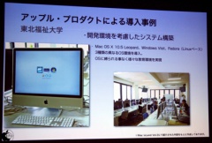 iMac を導入し、そこに Mac OS X だけでは無く、Windows XP・Windows Vista・Fedora Linux などを 教室毎に異なる 3OS づつ組み合わせてネイティブに動作させるrEFItを用いたTriple Boot環境を構築しました。Mac OS X 上で仮想環境として各種OSを用意するのでは無く、ネイティブ動作にこだわった理由は 動作速度。Xcode などでのアプリケーション開発や数値演算などを行う為に、仮想環境ではなく、ネイティブ動作としたという事でした。