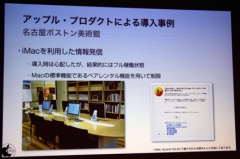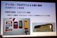 まずは、近年話題のデジタルサイネージ関連として、名古屋ボストン美術館における iPod touch による展示品案内システムが紹介されました。美術館の展示品案内システムとしては専用機が様々なベンダーからリリースされていますが、競合他社では無く iPod touch が選択されたのは「利便性」から。