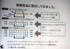 マルチコアへの対応に関して、Parallels Desktop 4.0 for Macは、実験的ながら8コアまでサポートしていると説明し、他のメーカーの仮想ソフトウェアの場合シングルCPUで1つの処理をする状態を複数のコアでエミュレートするという状態なのに対して、Parallels Desktop 4.0 for Macの場合は、複数処理をするマルチCPUを複数エミュレートすると説明してました。