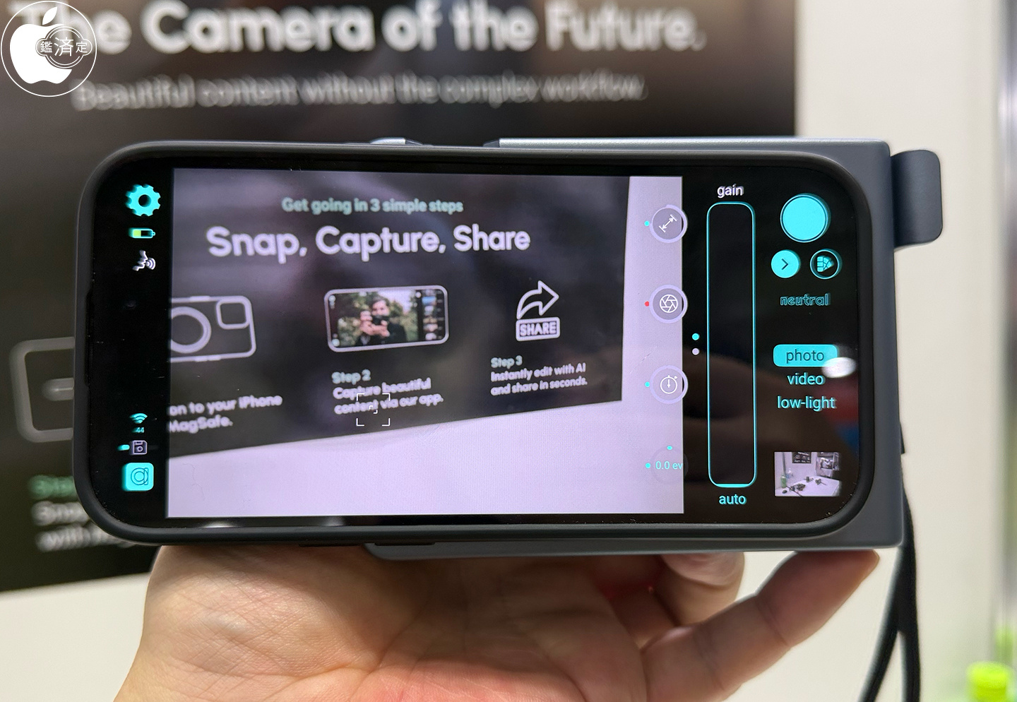 CP+2026において、Camera Intelligenceが、iPhoneのMagSafeマウントに対応したマイクロフォーサーズカメラアタッチメント「Caira」を展示していました。