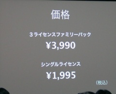 すでに発表されている価格「3,990円」は3ライセンスパックの価格で、シングルライセンスの場合は「1,995円」で販売するそうです。