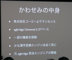 2009年10月4日にAUGM in OSAKA / October 2009において、物書堂が、現在開発中の日本語変換システム「かわせみ」の紹介を行ないました。