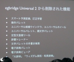 egbridge Universal 2では、他社の技術ライセンスを受けていた手書き認識機能や、ライセンスバンドルされていた電子辞書などは含まれておらず、また、品質上の観点から、スマート変換や訂正学習、ユニバーサルパレットなどの機能は削除されているそうです。