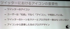 Twitterは、名前ではなく「アイコン」で判別しているので、Twitterのトーン&マナーとブログの不一致はもったいないと思え、アイコンからブログに誘導する場合、そのアイコンとブログデザインのマッチングは重要だと思うと話してました。