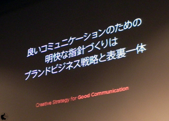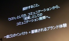 一般的に、体験とは語り継がれていくもので、それには「共感」と「ブランド知識」の提供が重要だと考えているそうで、良いコミュニケーションのための明快な指針づくりは、ブランドビジネス戦略と表裏一体だと話してました。