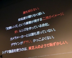 福井氏は、シグマ側に対して、消費者は、同社を安いレンズメーカーとしてしか認識しておらず、そもそも知名度が低いという問題を認識してもらうことからはじめたそうで、結構緊張したそうです。