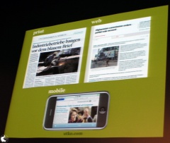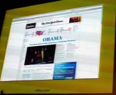 世界の主要な新聞のWebサイトは、オバマ大統領当選の時だけ、一斉にテンプレートを変えたが、その1日以外は、ずっと同じテンプレートを使い続けている。それっておかしくないか?と疑問を投げかけ、Webの新聞は、ブラックマンデーといった大きなニュースでも、ページ全面を埋め尽くすことはない。そもそもプレゼンテーションを行なうといった考えがないからだろうと話してました。