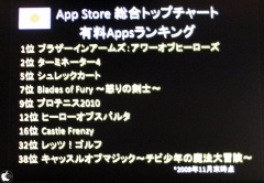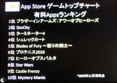 2009年11月時点での日本App Storeの有料ゲームトップランキングでは、10位以内のうち7タイトルがランキング入りを果たしていると説明していました。