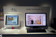 イベントスペースの中央には、Adobe Photoshop CS5 日本語版がインストールされたWindows PCと、Adobe Photoshop 1.0からAdobe Photoshop CS4までがインストールされて、Dockにアイコンが並んだ状態のPower Mac G5が展示されています。