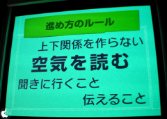 また、制作チーム作りの重要な点は、デザイナー、プログラマー、DTP/オペレーターこれらの連携をスムーズにする必要性があり、どこかの部門が主導性をもってしまうと効率が悪くなる。そうならないように、他部門とのコミュニケーションを図る必要があり、そこに分からないことがあれば、部門が違うからという前立ては必要無いと話し、進め方のルールとして、上下関係を作らず「聞きに行くこと、伝えること」を惜しまないようにし、空気を読むためにコミュニケーションの通気性を良くするよう考えた方が良いと思うと話してました。