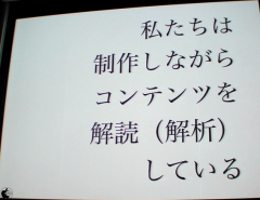 川原氏は、制作の仕事とは「書く人 情報を提供する側<―>情報を得る側 読む人」これを繋いでいることで、制作者は、制作しながら、そのコンテンツを解読(解析)していると話してました。