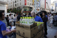 オープン前に並ぶお客さんに、Apple Storeからミネラルウォーターのサービスが行われ、オープン後には、Appleロゴ入りの大きな黒い日傘の貸出しサービスも行われていました。