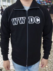 今年の参加グッズは、前にWWDCの文字ワッペンが施されたフリース素材のフルジップジャケットが配られました。