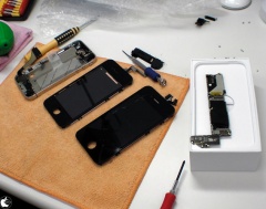 工房では、さっそくiPhone 4のフロントガラスを割った方や、裏側のガラスを割ってしまった方からの修理が持ち込まれていました。