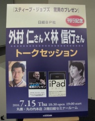 2010年7月15日に丸善丸の内本店にて「スティーブ・ジョブズ 驚異のプレゼン―人々を惹きつける18の法則」の刊行を記念して、長年Appleを取材している ITジャーナリストの林信行氏と、解説を担当した外村仁氏によるトークショーが行われました。