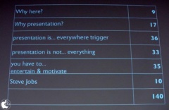 両氏共にトークショーで強調されていたことは「プレゼンは強く目標を定め、シンプルにすること」というテクニック以前の基礎の部分。「最近の流行りで言えば、言いたいことが Twitter で収まり切るのが理想」という事で、当日の林信行さんのプレゼンはスライドに掲載されている全文字数が 140文字という驚異のテクニックを披露されました。