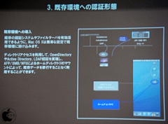 認証形態に関しては、新規で構築する場合と、すでに構築されてる環境に追加導入する場合とあり、OpenDirectory、Active Directory、LDAP認証を実現出来るので、既存環境に溶け込みやすいのが特徴だと説明していました。