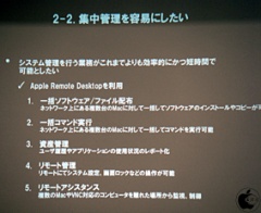 集中管理を容易にするApple Remote Desktopを導入した場合のメリットとして、ネットワーク上にある複数台のMacに対して、NetInstallによる一括インストールや、CUIによる一括コマンド実行による管理が行えることなどを上げていました。