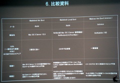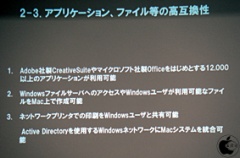 アプリケーションに関しては、アドビ システムズ、マイクロソフトなど12,000以上のアプリケーションが可能で、Windowsとの互換性については、ファイルサーバーへのアクセスや、Active Directoryを使用するWindowsネットワークにMacシステムを統合可能な点などを説明していました。