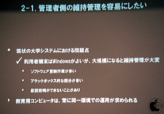 導入理由として、管理者側の維持管理が、Windowsで構築するとコストがかかり、管理が大変になってくる問題を解消するために、Mac OS X Server LeopardによるNetBoot管理の方が容易だと説明してました。