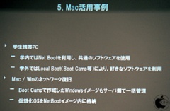 活用事例として、学内ではNetBootを、学外ではLocal Bootで好きなソフトウェアを利用してもらう事が出来ると説明していました。また、Boot Campで作成したWindowsイメージもサーバー側で一括管理できるほか、仮想化OSをNetBootイメージ内に格納でき、管理が容易だと説明していました。