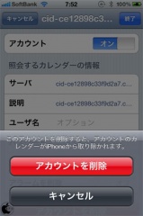 文字列だけの項目か、名称設定した項目をさらにタップして、アカウントを削除することで、カレンダーを削除することが出来ます。