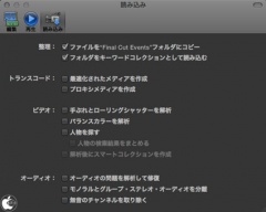 Final Cut Pro XのApple ProRes 422コーデック設定について、Final Cut Proヘルプ「「読み込み」環境設定」によると、環境設定>読み込みで、トランスコード「最適化されたメディアを作成」をチェックすると、 Apple ProRes 422 コーデック に トランスコードされ、「プロキシメディアを作成」にチェックを入れると、Apple ProRes 422(プロキシ)コーデック にトランスコードされるそうです。
