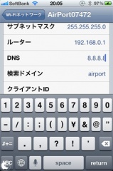 iPhone 4SをWi-Fi接続し、接続している設定>Wi-FI>接続しているネットワークを選択して、DNSをGoogle Public DNSの「8.8.8.8」(8.8.4.4 も利用可能)に変更します。