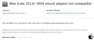 Appleが、サポート情報「iMac (Late 2012): VESA mount adapter not compatible」を公開し、iMac (27-inch, Late 2012)、iMac (21.5-inch, Late 2012)は、現時点でVESAマウントアダプタをサポートしていないと説明しています。