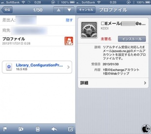 iPhone側で添付ファイル付きのメールを受信したら、プロファイルをタップしてインストールします。
