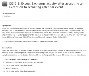 Appleが、サポート情報「iOS 6.1: Excess Exchange activity after accepting an exception to recurring calendar event」を公開し、マイクロソフトが公開したサポート情報「トランザクション ログ、CPU 使用率、および Exchange Server 6.1 をベースに iOS デバイスを使用して、ユーザーのメールボックスを同期すると 2010 年のメモリ消費量の急速な増加」に関連した内容を公開しています。