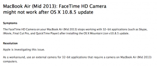 Appleが、サポート情報「MacBook Air (Mid 2013): FaceTime HD Camera might not work after OS X 10.8.5 update」を公開し、MacBook Air (Mid 2013)でOS X Mountain Lion 10.8.5アップデート後、FaceTime HDカメラが動作しない問題を調査していると案内しています。