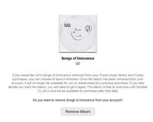 Appleが、U2のニューアルバム「Songs of Innocence」を、10月13日までの期間限定で無料配布を行なっていますが、Appleのサポート情報「Remove iTunes gift album "Songs of Innocence" from your iTunes music library and purchases」によると、ダウンロードした「Songs of Innocence」をライブラリーから削除すると、購入履歴には表示されないため、再度ダウンロードする場合は有料になると説明がされています。