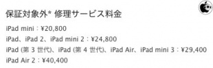 Appleが、サポート情報「iPad の修理サービス」の「保証対象外 (OOW) 修理サービス」を更新し、液体侵入が原因で故障したiPad mini 3、iPad Air 2などを交換修理(本体交換)する場合の金額は、iPad mini 3が「29,400円」、iPad Air 2が「40,400円」と案内しています。