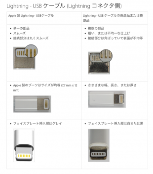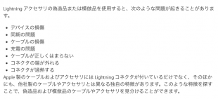 また、Lightning アクセサリの偽造品または模倣品を使用すると、デバイスの損傷、同期の問題、ケーブルの損傷、充電の問題、ケーブルが正しくはまらない、コネクタの端が外れる、コネクタが過熱するといった問題が生じることがあると説明しています。