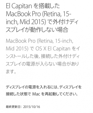 Appleが、サポート情報「El Capitan を搭載した MacBook Pro (Retina, 15-inch, Mid 2015) で外付けディスプレイが動作しない場合」を公開しています。