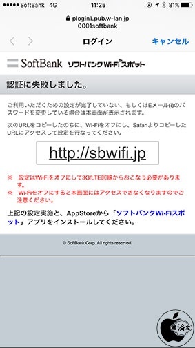 認証に失敗しました。と表示される画面にある「http://sbwifi.jp」をコピーして、iPhoneまたはiPad with Wi-Fi + CellularのWi-Fi設定をオフにします。