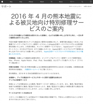Appleが、熊本地震 (2016年)で被害を受けたアップル製品を特別修理する「熊本地震被災地向け特別修理のご案内」を公開しています。