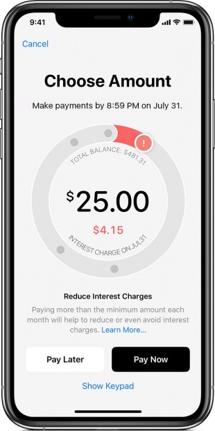Apple Cardにはアカウントを維持するための最低額支払も可能で、ホイールを回して感嘆符が表示されるまでスライドさせ、そこで表示された金額を支払えば維持できます。