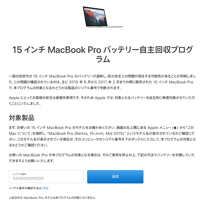 Appleは、2015年9月から2017年2月までの間に販売された「MacBook Pro (Retina, 15-inch, Mid 2015)」を対象にした「15 インチ MacBook Pro バッテリー自主回収プログラム」を実施しています。