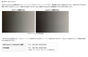 1番のモニター接続台数の制限は、M1チップ搭載Macの制限のため仕様として諦めるほかありませんが、それだけでなく、Macから出力される映像信号のカラーフォーマットがYUVリミテッドレンジとなり、階調飛びが生じる場合があるそうです。
