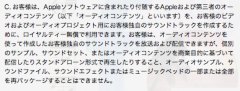 「Appleソフトウェアに含まれたり付随するAppleおよび第三者のオーディオコンテンツを、お客様のビデオおよびオーディオプロジェクト用にお客様独自のサウンドトラックを作成するために、ロイヤルティー無償で利用できます。お客様は、オーディオコンテンツを使って作成したお客様独自のサウンドトラックを放送および配信できますが、個別のサンプル、サウンドセット、またはオーディオコンテンツを商業目的に基づいて配信したりスタンドアローン形式で再生したりすること、オーディオサンプル、サウンドファイル、サウンドエフェクトまたはミュージックベッドの一部または全部を再パッケージすることはできません。」