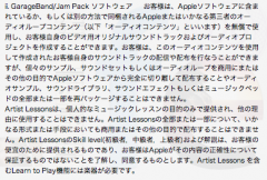 また、GarageBand/Jam Packソフトウェアに関しては、このオーディオコンテンツを使用して作成された自身のサウンドトラックの配信や配布を行なうことができるが、個々のサンプル、サウンドセットもしくはオーディオループを商用にまたはその他の目的でAppleソフトウェアから完全に切り離して配布することやオーディオサンプル、サウンドライブラリ、サウンドエフェクトもしくはミュージックベッドの全部または一部を再パッケージすることはできないと説明しています。