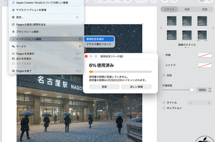 Apple Creator Studioにサブスクリプションし、Pagesの新規ファイルを作成し、メニューの挿入>コンテンツハブを表示し、任意の画像を選択します。