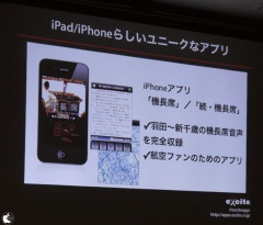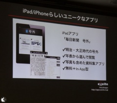ユニークなiPadアプリとして「毎日新聞 号外」や、iPhone/iPadマガジンアプリ「エキサイトイズム App」などがあると紹介していました。