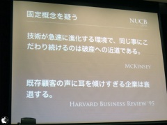 ここで学ぶことは、固定概念を疑うことから始まり、同じ事にこだわり続ける事、顧客への耳を傾けることは破綻への近道といった研究結果があり、Appleの魅力は「宗教的反応」を起こさせるほど歴史に残す物を残していると会社だと紹介していました。