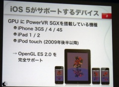 iOS 5から、OpenGL ES 2.0に対応したPowerVR SGX搭載端末だけをサポートするようになり、覚える事も増えたのだが、それらを解消する技術も追加されていると説明していました。